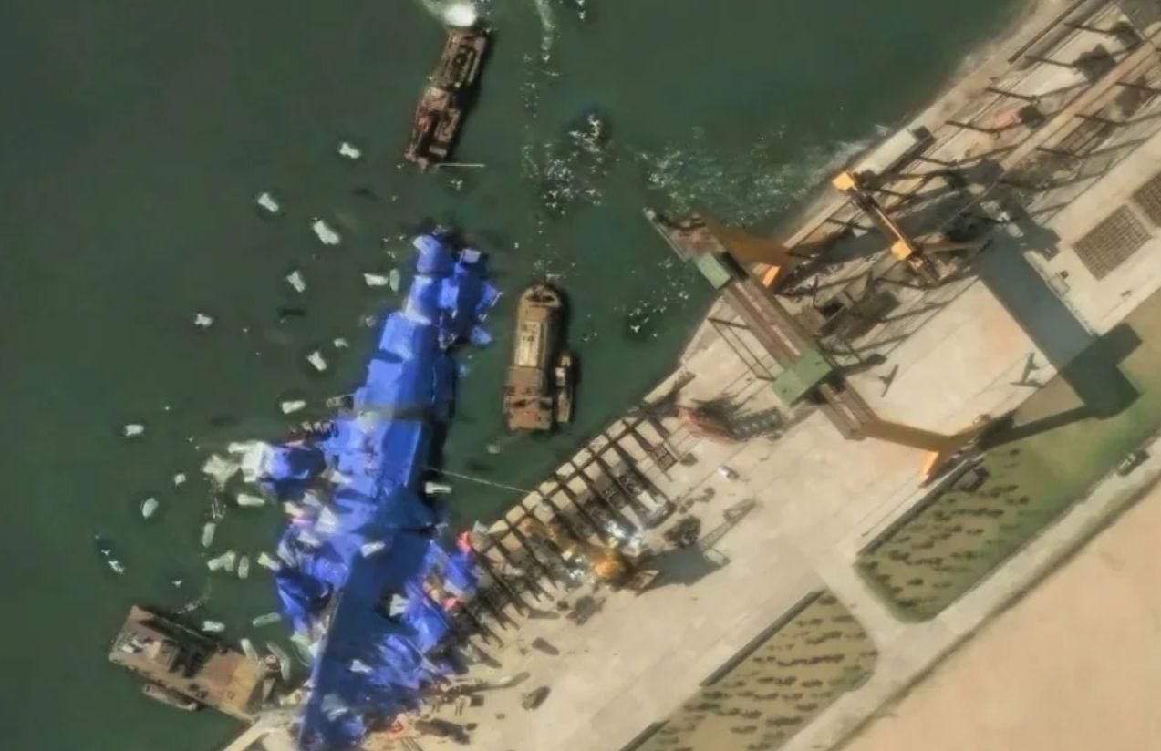 Nuevas imágenes satelitales revelan que Corea del Norte ha desplegado lo que parecen ser globos alrededor de su moderno destructor de 5.000 toneladas, actualmente varado y parcialmente sumergido tras un fallido intento de botadura la semana pasada.