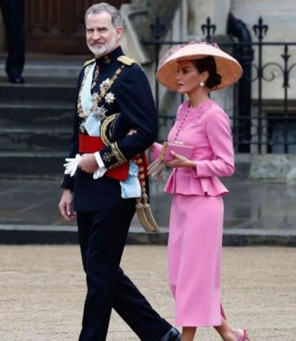 Una de las figuras que brilló con luz propia fue la bellísima reina Letizia de España. Con su elegancia habitual y su figura impecable, lució un traje rosa fuerte de Carolina Herrera. El conjunto constaba de una chaqueta de manga larga con bordados alrededor del cuello y cierre delantero con botones forrados y con una falda midi.