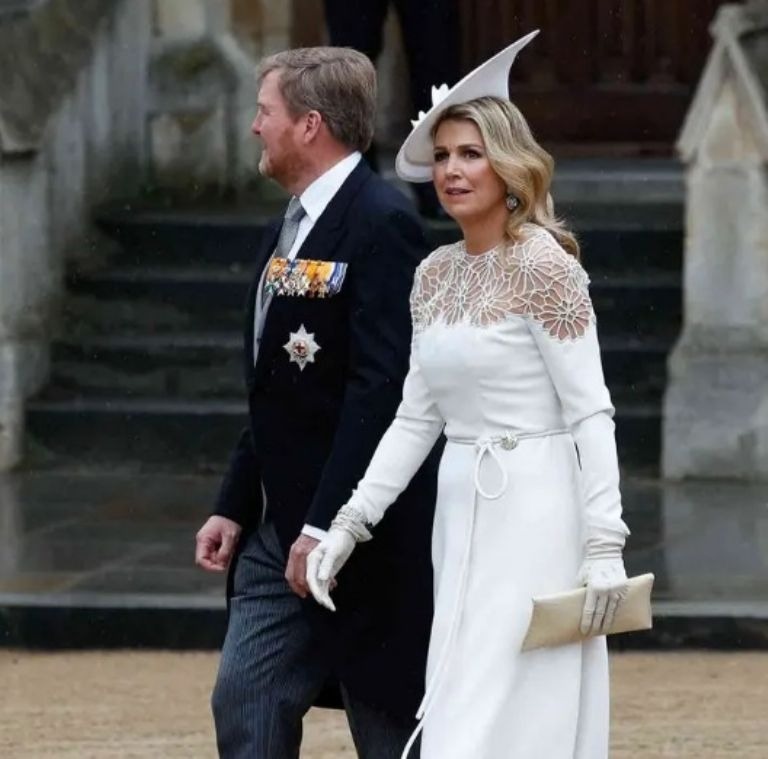 Por su parte, la reina de los Países Bajos, Máxima Zorreguieta, conocida por sus atuendos coloridos y llamativos, optó por un enfoque más conservador en esta ocasión, pues su vestido blanco de manga larga y escote de encaje estaba complementado con un cinturón de cordel, le dieron un toque distinguido y elegante.