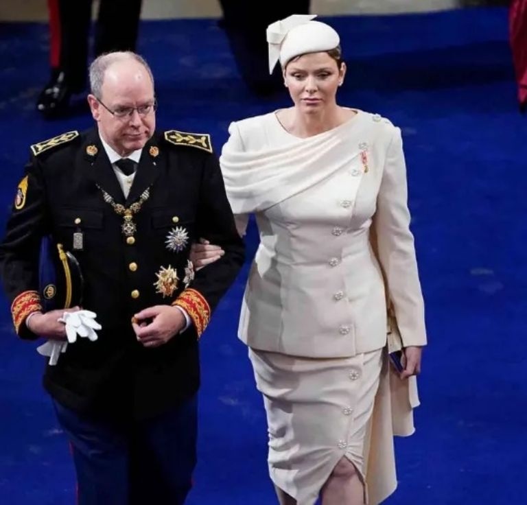 Otra destacada del evento fue la gran Charlene de Mónaco, quien eligió un traje de chaqueta larga con un foulard que caía por uno de los laterales, adornado con botones joya. Su falda por debajo de la rodilla, con abertura y los mismos botones de la chaqueta, le dieron un estilo único y refinado.