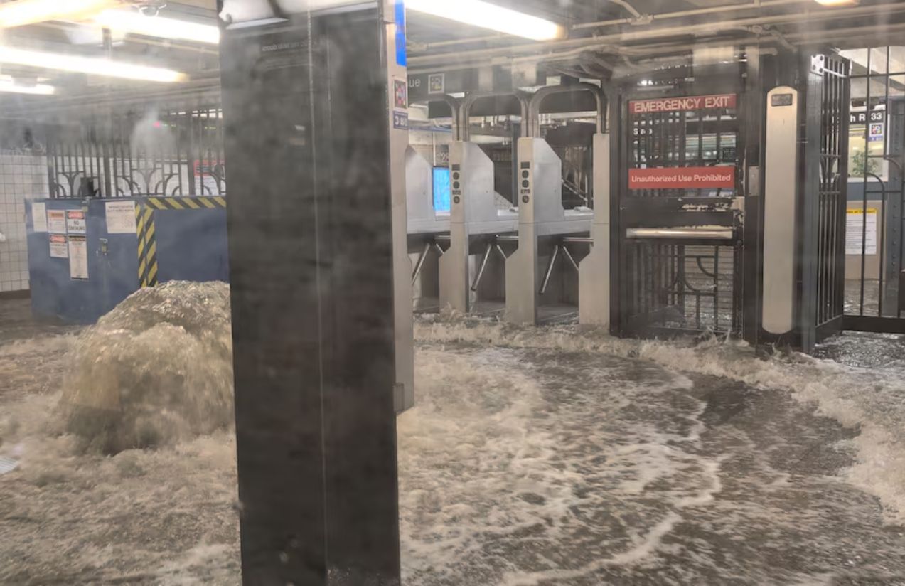 En la ciudad de Nueva York, las fuertes lluvias anegaron estaciones del metro, paralizando parcialmente el sistema de transporte. En la estación 28th Street, un video verificado por Reuters mostró cómo el agua irrumpía con fuerza en el andén, mientras pasajeros observaban desde un tren detenido. Otros usuarios difundieron imágenes de personas intentando subir escaleras parcialmente cubiertas por el agua o trepando sobre los asientos para evitar el contacto con las zonas inundadas.