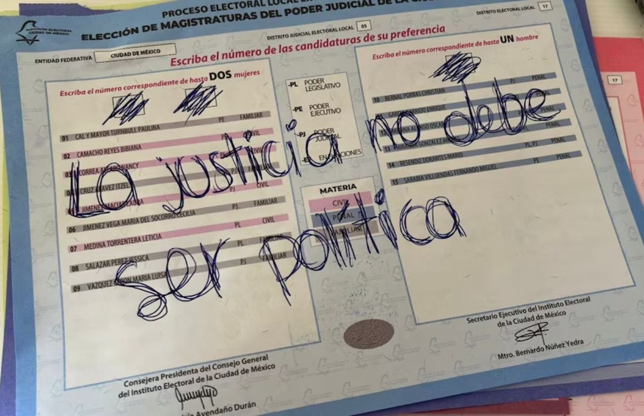 Aunque el índice de abstención fue elevado, miles de personas decidieron participar anulando su voto de forma deliberada. Las boletas se convirtieron en lienzos de protesta: escritas a mano, muchas expresaban indignación, ironía o tristeza. Frases como “RIP al Poder Judicial”, “Esta reforma no es del pueblo, es de Morena” y “La justicia no debe ser política” se viralizaron en redes sociales. También aparecieron mensajes solidarios con causas sociales: “Mi voto va para las personas desaparecidas y las madres buscadoras”. Otros dejaron ver frustración: “Con odio y tristeza” o “Lo siento por los funcionarios del INE que están contando esta chingadera”.