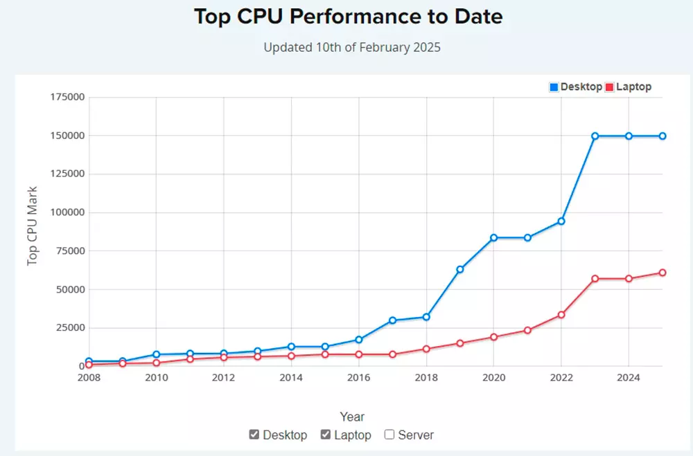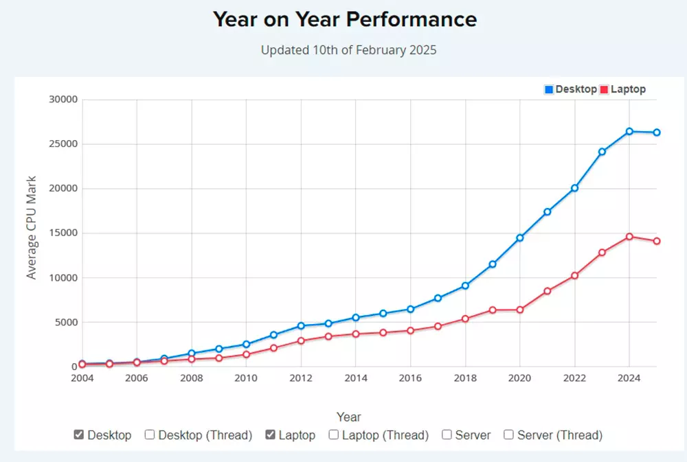 PassMark ha publicado un gráfico actualizado que muestra la evolución del rendimiento de los procesadores desde 2004 hasta febrero de 2025. Es importante destacar que estos datos reflejan el rendimiento de los equipos utilizados por los usuarios que ejecutan el software de PassMark, no solo el de las CPUs más recientes del mercado.