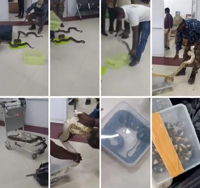 Una mujer fue detenida en el aeropuerto de Chennai, en India, después de que se descubriera que llevaba un cargamento algo inusual en su maleta. Las autoridades aduaneras encontraron 22 serpientes de diferentes especies y un camaleón dentro de los recipientes de plásticos sellados con cinta adhesiva.