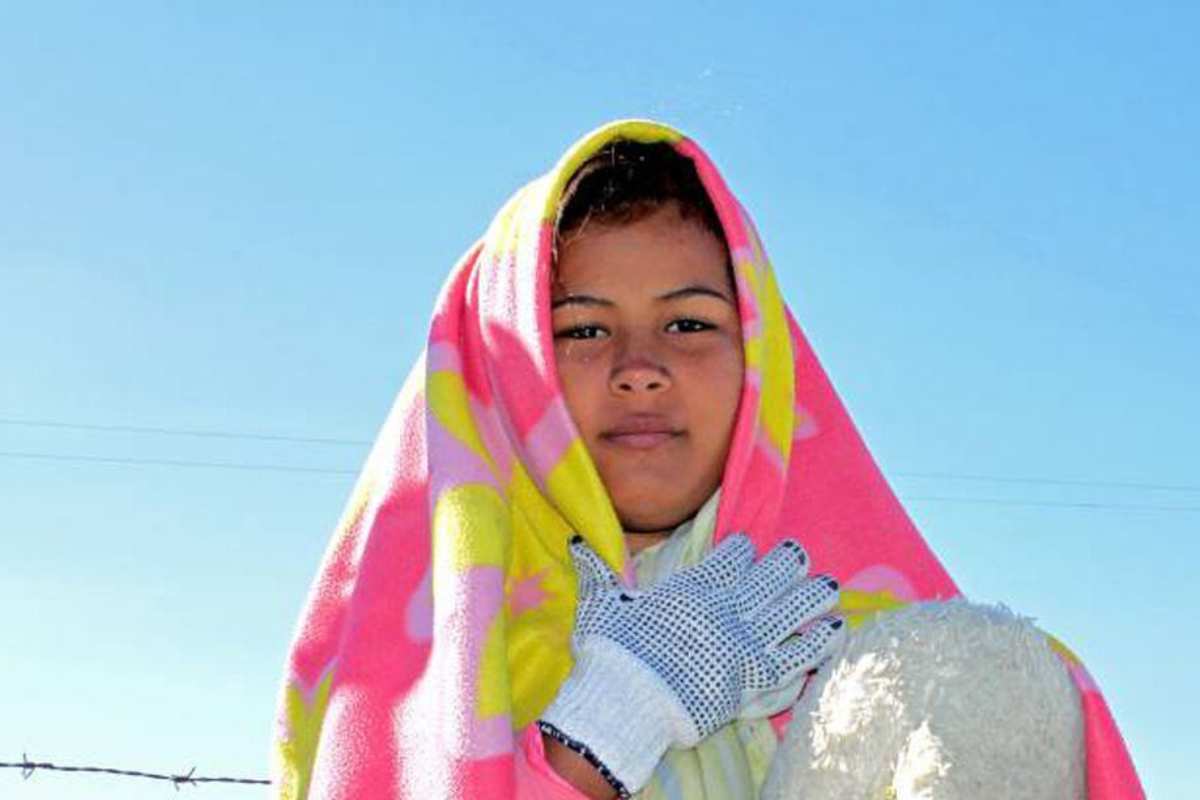 Una niña de nacionalidad colombiana se escondía en un baño portátil como un refugio para protegerse del fuerte frío viento mientras ella y sus padres se encontraban esperando en un campamento totalmente improvisado.