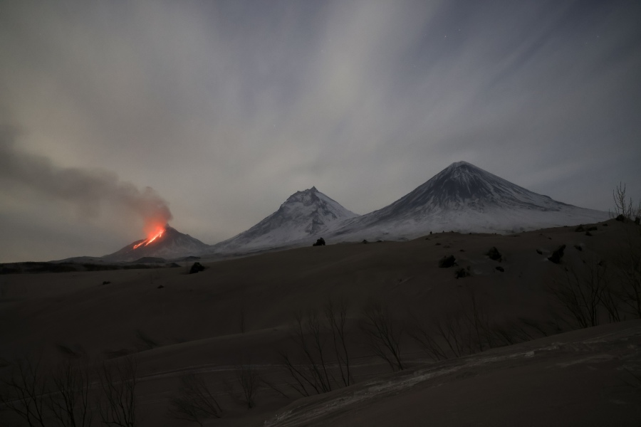 El Servicio Geofísico de la Academia de Ciencias de Rusia informó que la erupción comenzó a las 0:54 hora local del día 10 de abril, lanzando una columna de cenizas que alcanzo una altura de 20 kilómetros, por tal motivo los sismólogos designaron a la erupción en el nivel «rojo» de peligro para la aviación, siendo este el máximo posible.