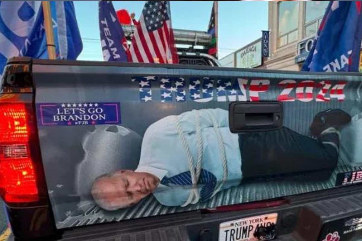 Dicho video muestra dos camionetas con unas banderas y varias calcomanías que expresan total apoyo al expresidente, la fotografía de Joe Biden se encontraba en la parte de atrás de la segunda camioneta que estaba en el lugar.