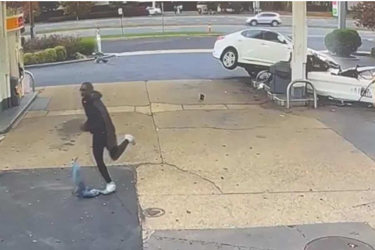 Un video que fue obtenido por WUSA muestra cómo el auto entra a toda velocidad en el estacionamiento, chocando contra un poste donde salen volando trozos del vehículo, el hombre derribó por completo la gasolinera, saltando inmediatamente del auto y huyendo del lugar.